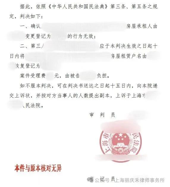 于是,上海丽庆禾律师事务所刘文庆律师和姚晨律师从协商变更程序违法入手提起诉讼,确认房屋承租人由老严变更为严三的行为应属无效,房管单位应将租赁户名恢复登记为老严,法院经审理后全面支持了简宁的诉请,我们也成功替简宁守住合法权益!