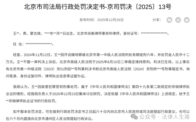 京司罚决〔2025〕13号 | 一律师因犯开设赌场罪判刑六年,并处罚金人民币十二万元!